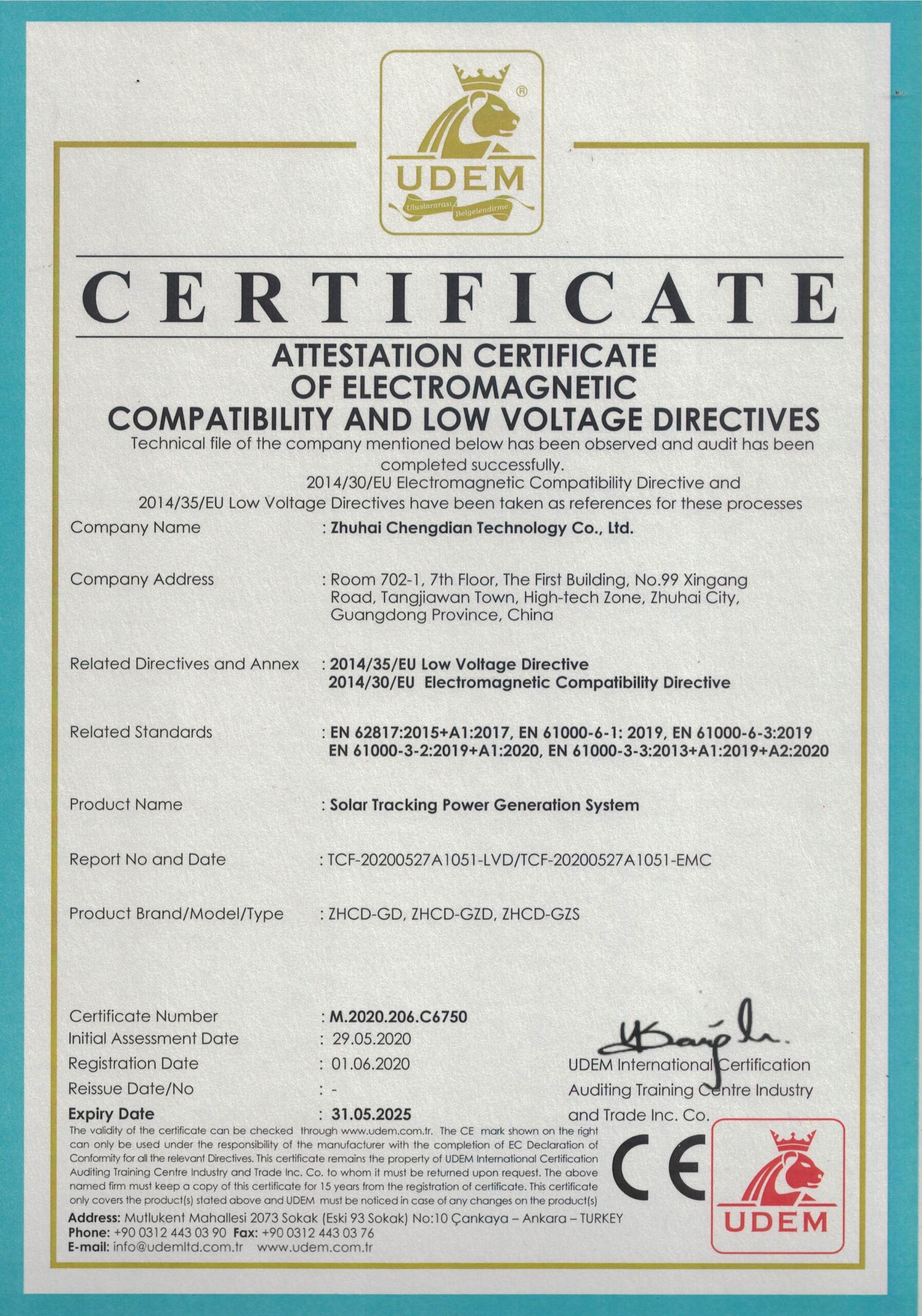 CE Attestion Certified of Electro Magnetic Compatibility and Low Voltage Directives